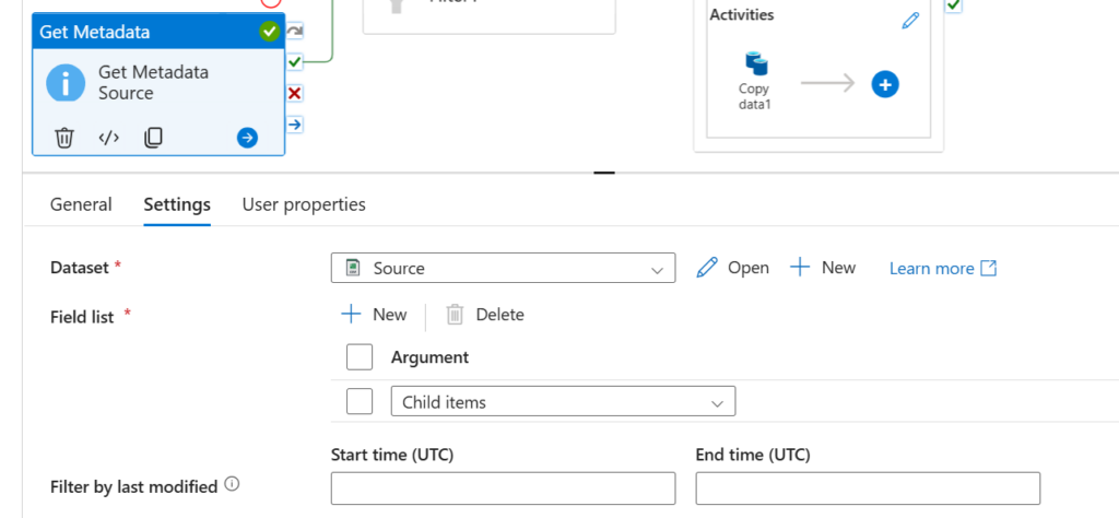 Możem teraz utworzyć pipeline. Wybieramy akcję Get Metadata Source i wybieramy argument child items – pobierze informacje wtedy o plikach w tym folderze