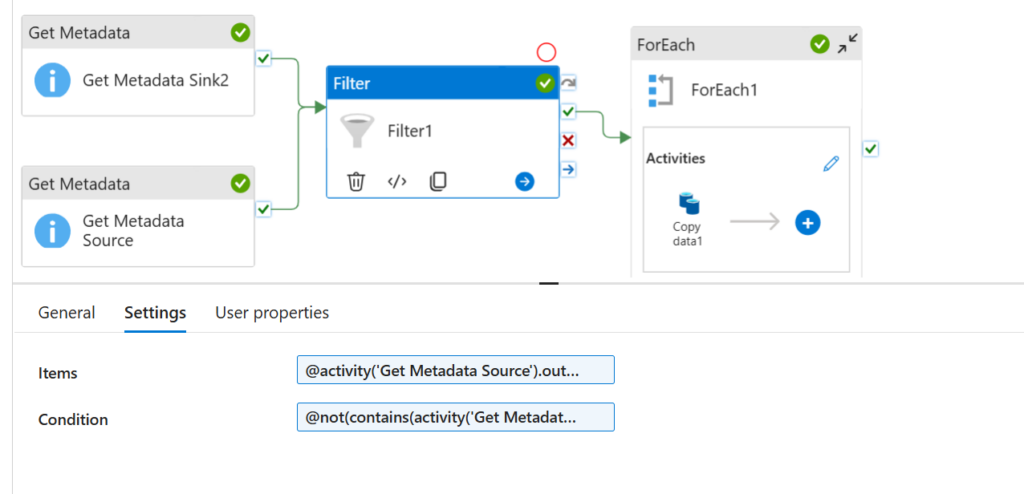 Tzn. zaprzeczenie tego, że item(), czyli to co zaznaczyliśmy w zakładce Items zawiera się w outpucie z get metadata z folderu docelowego.