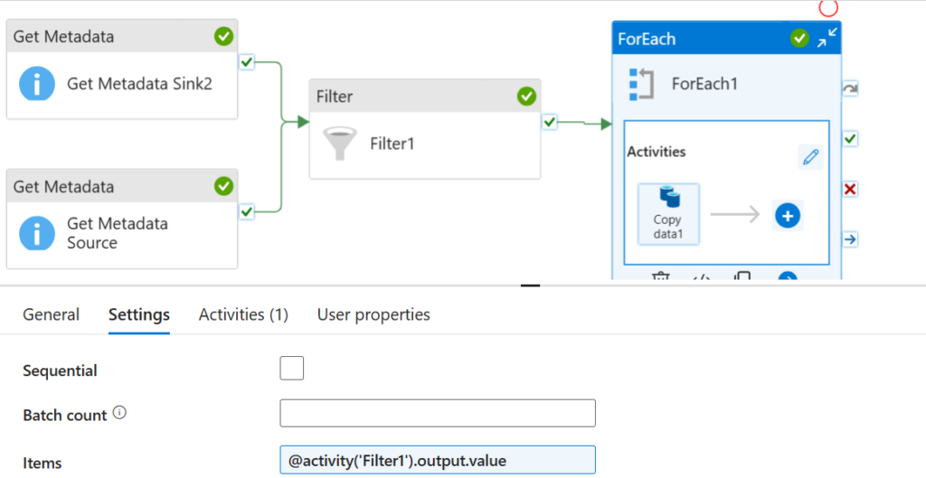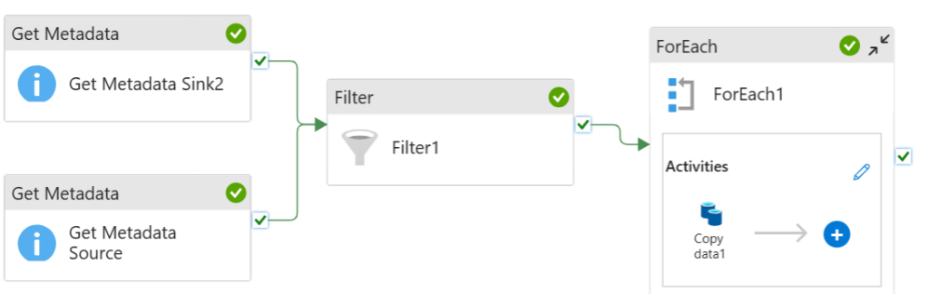 Pobieramy informacje o plikach w folderze 1 (źródłowym) i folderze 2 (docelowym), następnie filtrujemy takie pliki z folderu 1, które nie występują w folderze 2 i dla każdego takiego znalezionego pliku tworzymy operację copy data.