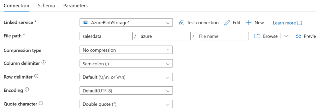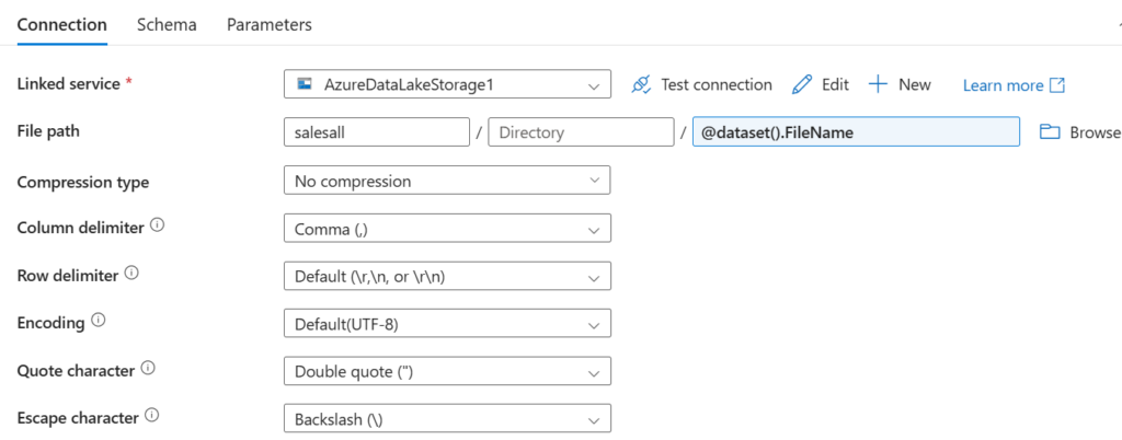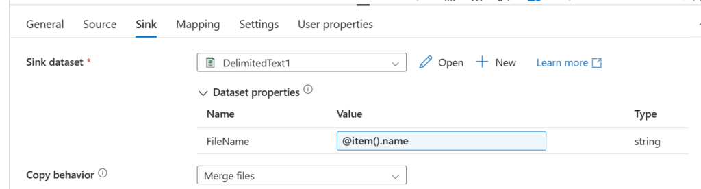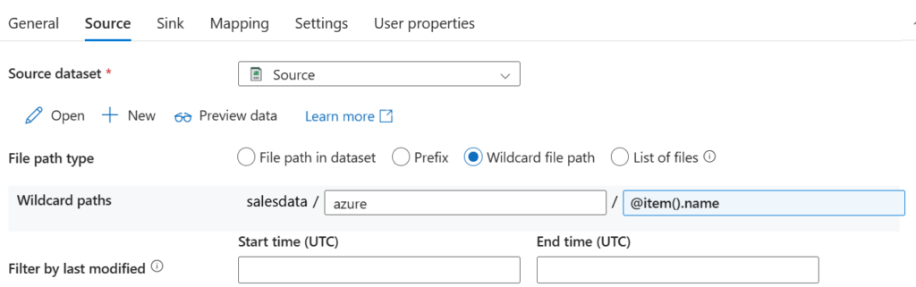 Jako Source możemy wykorzystać utworzony wcześniej dataset z folderu źródłowego. Jednak musimy dodać nazwę pliku – add dynamic content i wpisać @item.name.