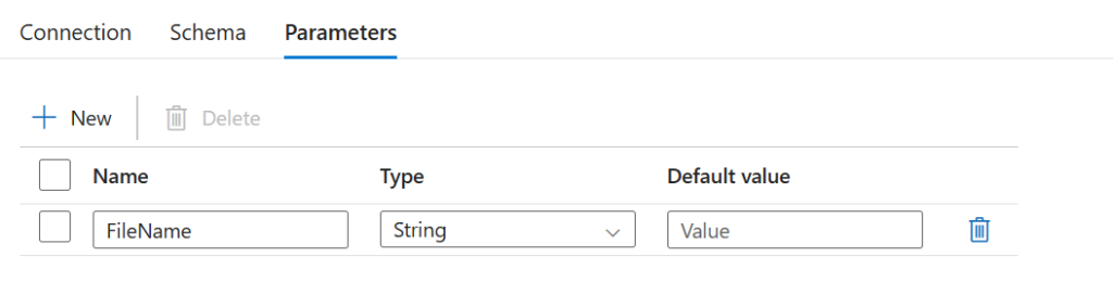 W Sink musimy utworzyć parametr, który będzie wskazywał na nazwę pliku. Nie znamy przecież nazwy pliku docelowego – musimy odwołać się do outputu z akcji Filter. Utworzyliśmy też nowy dataset z parametrem: