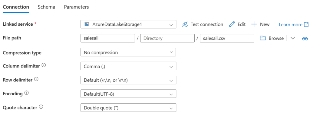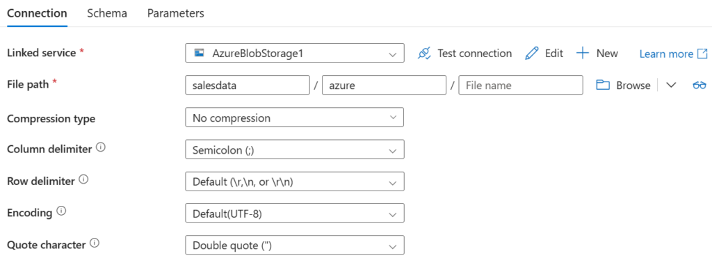 Następnie tworzymy dataset dla źródła danych. Tworząc dataset wybieramy Azure Blob Storage, a następnie format plików jakie będziemy pobierać – csv. Następnie wybieramy nasz linked service, nazwę naszego bloba i przechodzimy do konkretnego pliku lub zaznaczamy cały folder. W naszym przypadku za jednym razem chcemy pobrać wszystkie pliki, więc zaznaczamy cały folder. Powinien pokazać się nam następujący widok: