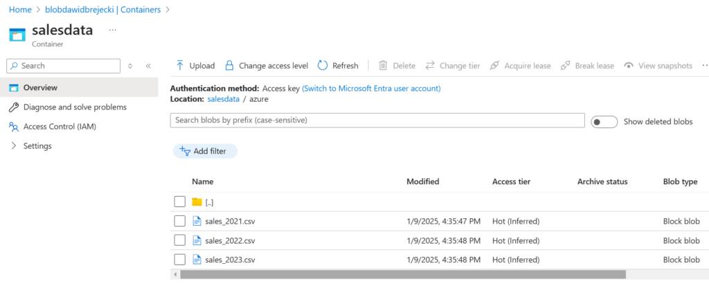 W kontenerze usługi Blob Storage umieszczonych jest większa liczba plików .csv. Naszym zadaniem jest utworzyć plik zbiorczy zawierający kontent ze wszystkich tych plików i wysłać na lokalizację w Azure Data Lake. W naszym blobie mamy trzy pliki do skopiowania: