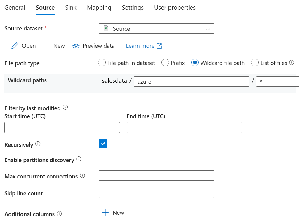 W File path type zaznaczamy Wildcard file path, ponieważ chcemy pobrać wszystkie pliki. Gdybyśmy chcieli pobrać konkretny plik, zaznaczylibyśmy File path in dataset. Jeżeli mielibyśmy utworzoną wcześ niej listę plików – List of files. Prefix – jeśli chcielibyśmy pobrać tylko pliki z nazwą rozpoczynającą się od wybranego ciągu znaków.