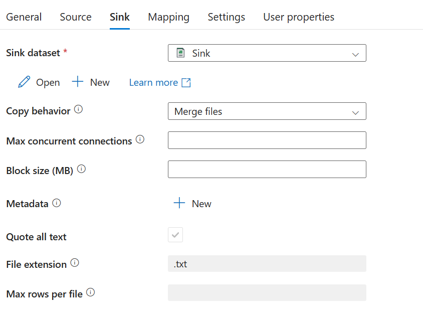 W zakładce Sink zaznaczamy utworzony wcześniej dataset i copy behavior. Zaznaczamy tu Merge files aby połączyć wszystkie pliki w jeden. Inne opcje – Flatten hierarchy oznacza że w przypadku kopiowania wielu plików ze źródła które zawiera podfoldery, w folderze docelowym nie będzie już podfolderowych tylko „spłaszczona” hierarchia plików. Opcja preserve hierarchy zachowuje podfoldery.
