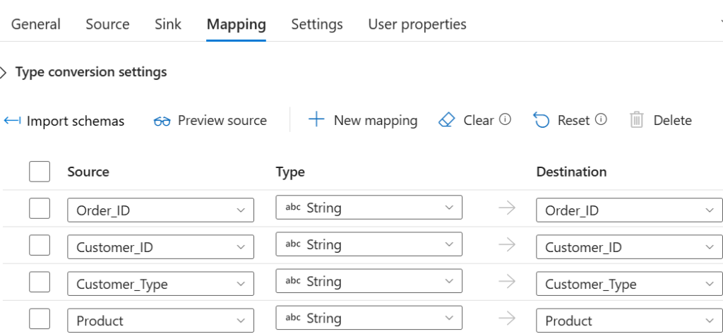 W zakładce Mapping, po kliknięciu opcji Import schemas możemy zmienić typ danych, dodać i odjąć kolumny które miałyby się pojawić w pliku docelowym. W naszym przypadku nie zmieniamy nic.
