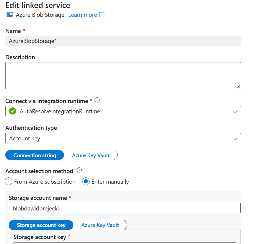 Najpierw utworzymy linked service dla Bloba i Data Lake:
