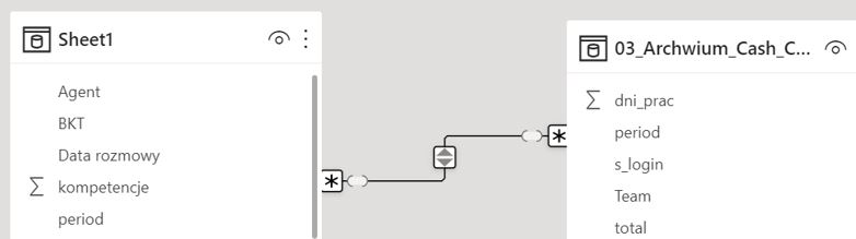 Nie możemy ingerować w model. Musimy utworzyć wizualizację (matrix) w której po stronie wierszy jest period, w kolumnach „s_login”, a jako wartości występuje „total” z tabeli Archiwum oraz „kompetencje” z tabeli Sheet1. Wiemy, że kolumnami po których powinien propagować się filtr, są Agent i s_login – zawierają te same wartości, ale w Power BI nie ma możliwości aktywować więcej niż jednej relacji na raz. Tworząc żądaną tabelę, mamy odpowiednie wartości dla „total” (ponieważ jest filtrowany przez występujące w wizualizacji period i s_login z tej samej tabeli modelu, ale dla „kompetencje” wyniki są co prawda podzielone przez kolumnę „period”, ale dla wszystkich agentów takie same.