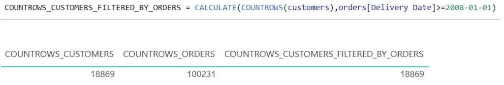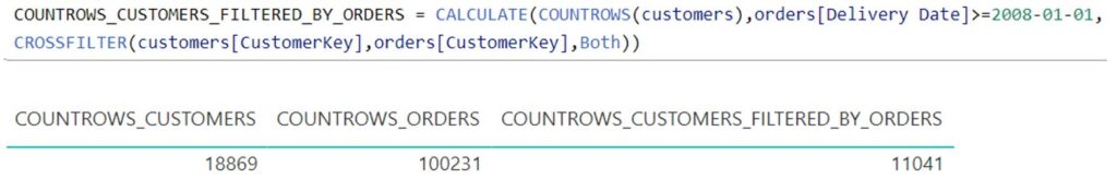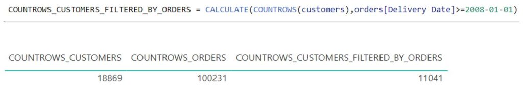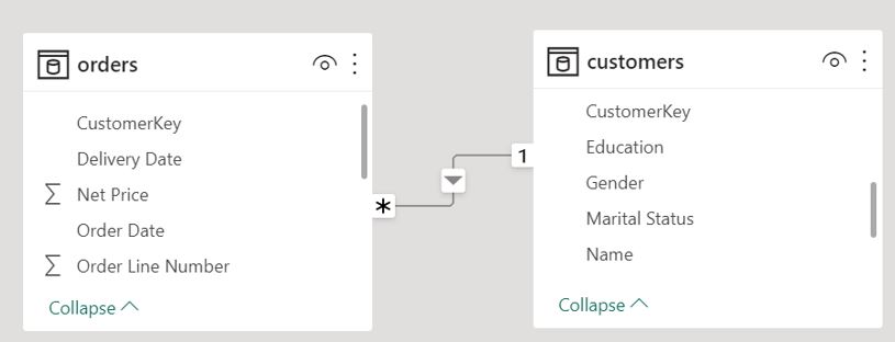 Zwyczajowo w DAX filtrowanie tabel odbywa się w kierunku 1 do wielu, np. customers filtrują tabelę orders:
