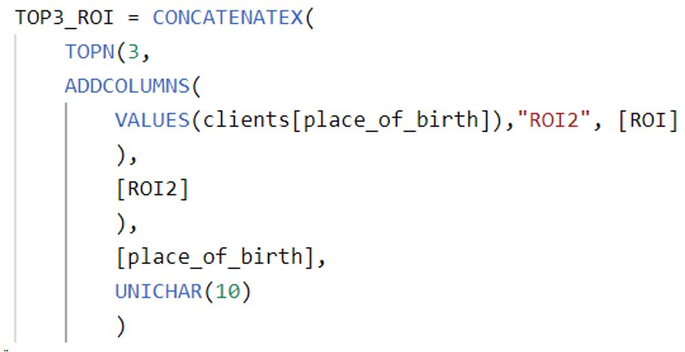 Za pomocą ADDCOLUMNS tworzymy tabelę z unikatowymi wartościami place_of_birth oraz przypisanymi do nich wartościami ROI. TOPN filtruje tę tabelę do trzech z największym ROI. Funkcja CONCATENATEX łączy wartości place_of_birth w jedną komórkę, oddzielając wartości UNICHAR(10) czyli przejściem do nowej linii.