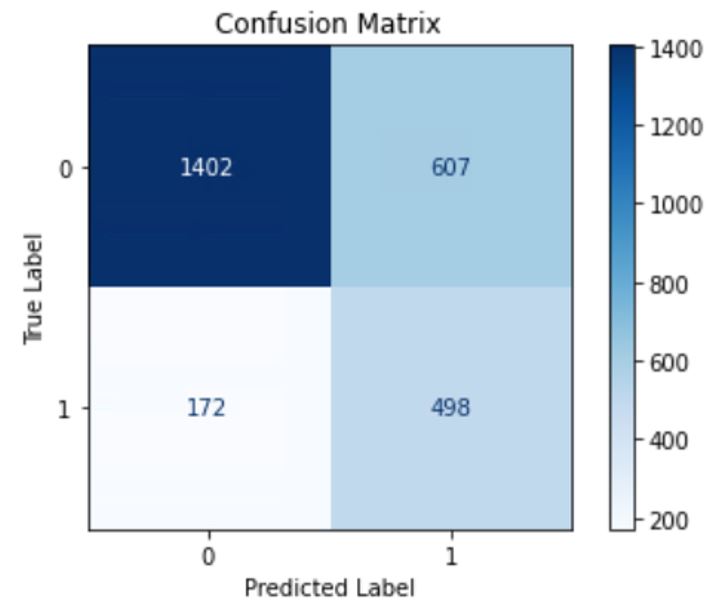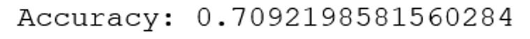 Skuteczność klasyfikacji na zbiorze testowym wyniosła 71%. Jest to akceptowalny wynik. Niepożądanym zjawiskiem jest skłonność modelu do traktowania obserwacji pozytywnych jako negatywnych. Przyczyną może być niezbalansowanie zmiennej docelowej.