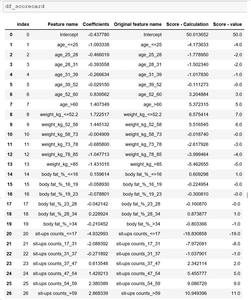 df_scorecard['Score - Calculation'] = df_scorecard['Coefficients'] * (max_score - min_score) / (max_sum_coef - min_sum_coef)