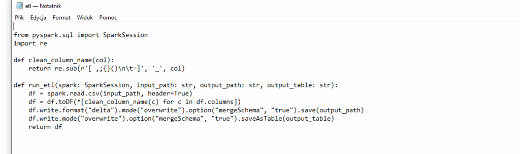 Widzimy że możemy rozbić notebooka na funkcję konfigurującą dostęp do Azure Data Lake oraz funkcję wykonującą naszą prostą ETL – ładowanie pliku i zapis do Delta