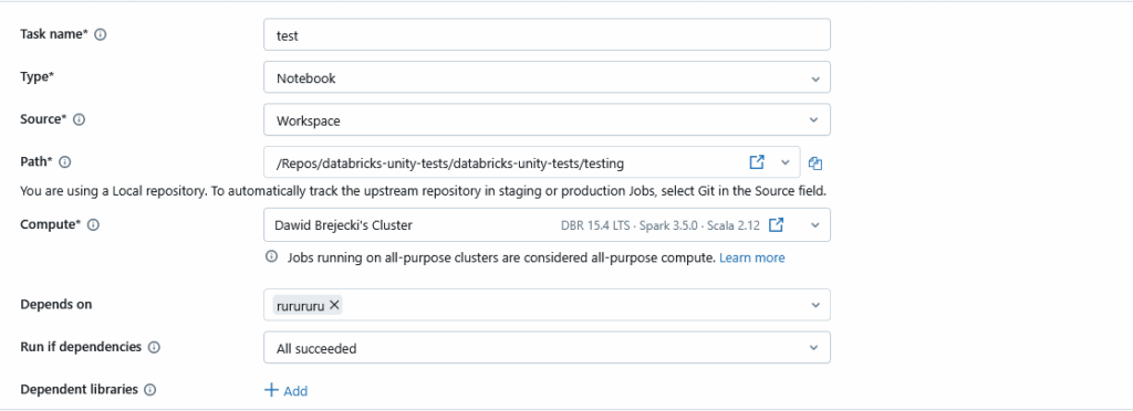 Do naszego joba możemy dodać kolejny task. Dodamy np. notebooka z testami jednostkowymi: