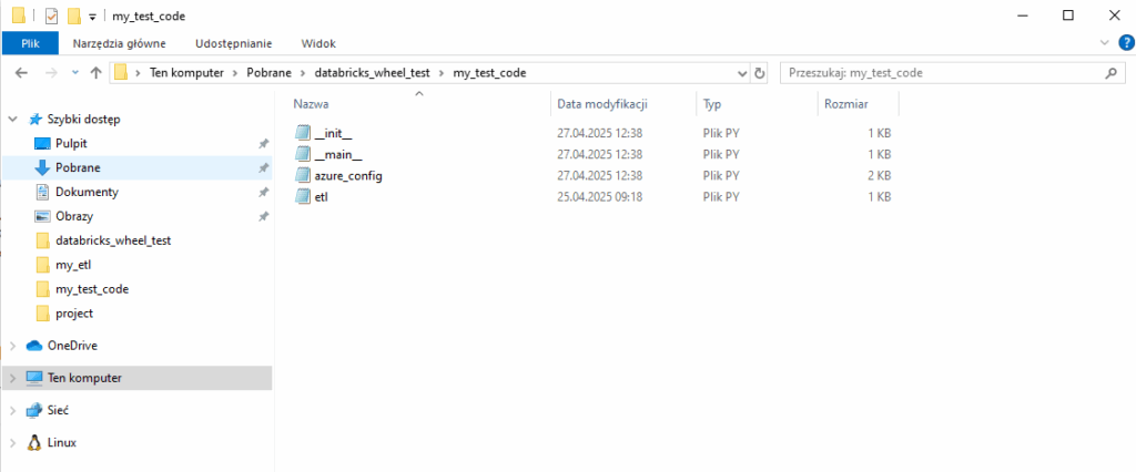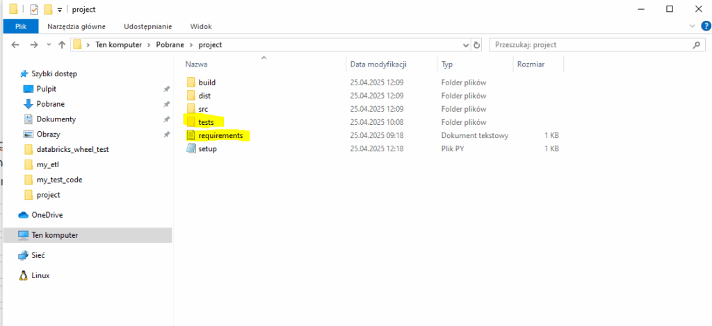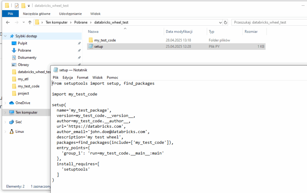Teraz tworzymy plik setup.py, który skomponuje nam nasz projekt w plik .whl który wgramy do Databricks. Zgodnie z dobrymi praktykami umieszczamy go luzem w naszym folderze: