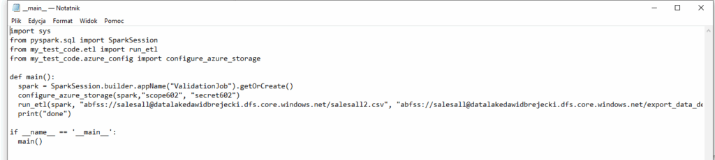 W pliku __main__.py tworzymy funkcję main(), która będzie wywołana przez joba. Spójrzmy na import funkcji. my_test_code jest nazwą folderu w którym umieściliśmy pliki .py: