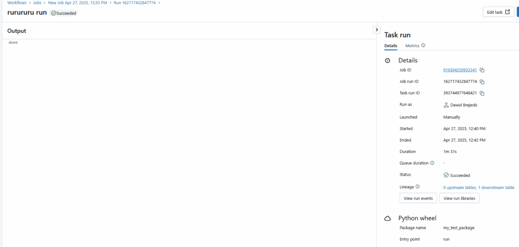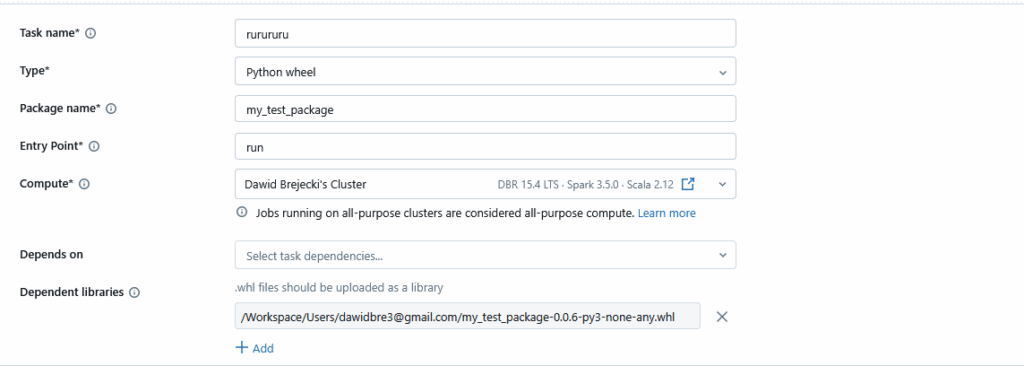 Wpisujemy dowolną nazwę w task_name, type – Python wheel, Package name – nazwę projektu określoną w pliku setup.py, Entry Point – nazwę naszego checkpointa uruchamiającego funkcję, Compute – tworzymy nowy klaster lub wybieramy spośród istniejących, Dependent libraries – uploadujemy utworzony lokalnie plik .whl
