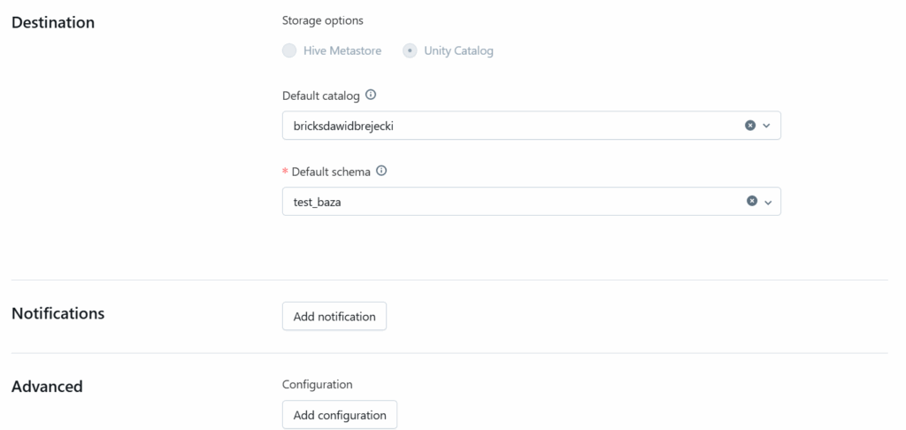 Wybieramy też lokalizację tabel i widoków zmaterializowanych w Unity Catalog: