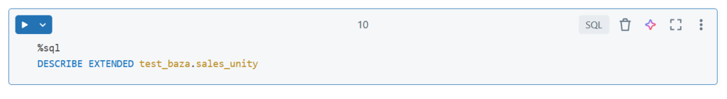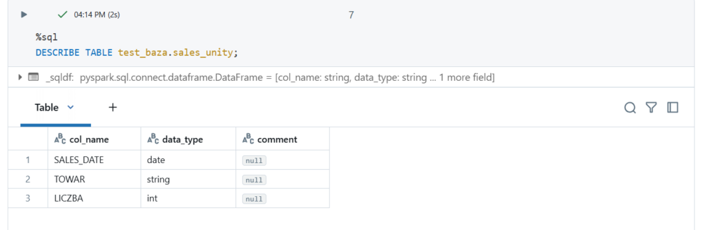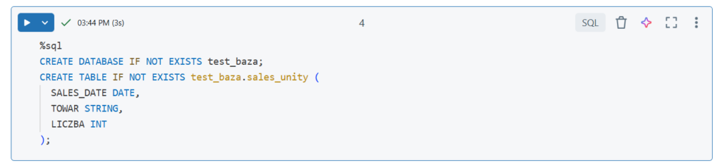 Na końcu statementu możemy podać w jakich formacie utworzyć tabelę. Domyślnie jest zapisywana jak Delta Table więc nic nie musieliśmy dopisywać