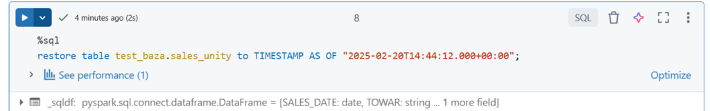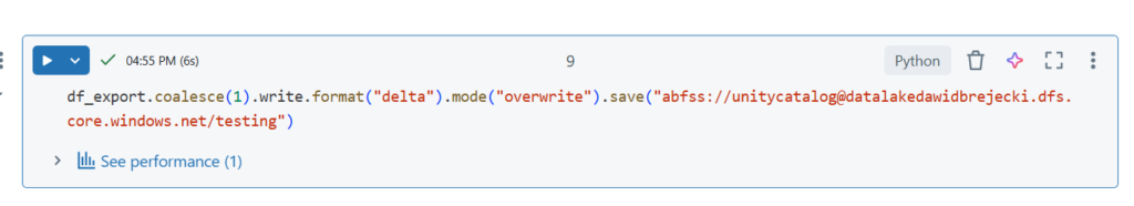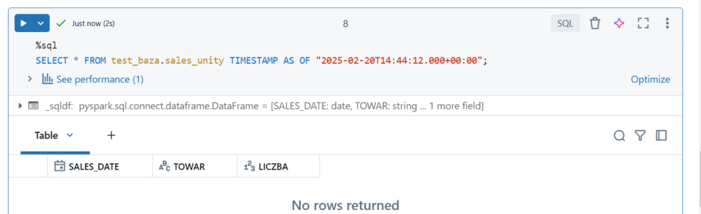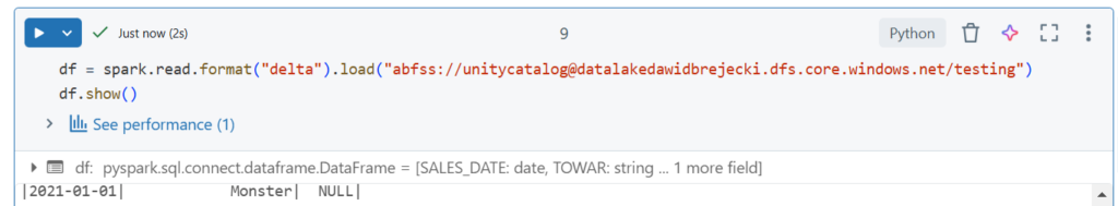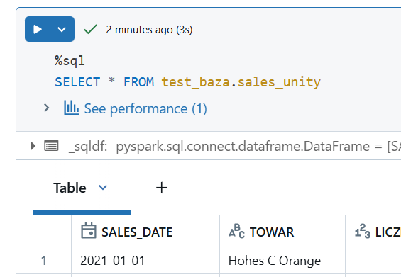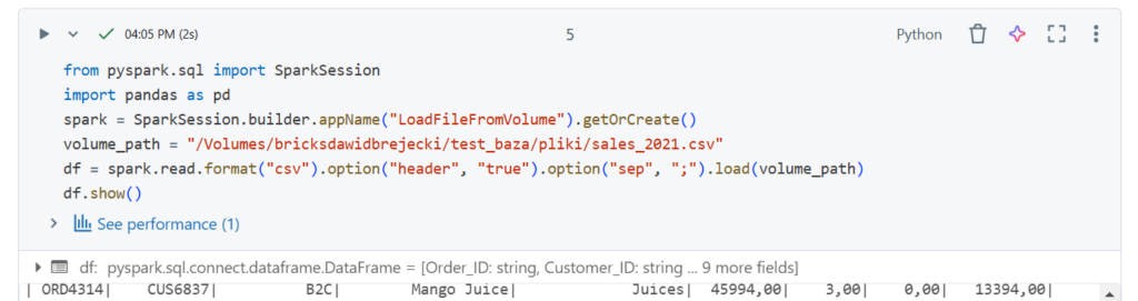 Wczytajmy plik z wolumenu „pliki” w tej samej bazie, zapiszmy do Dataframe i wybrane kolumny do tabeli.