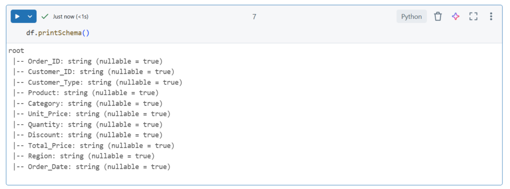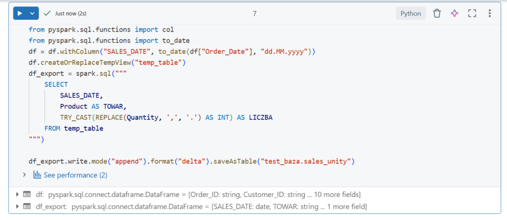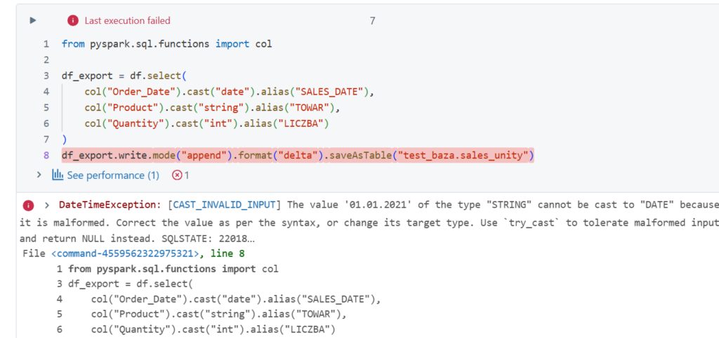 Pomimo zmiany typów danych wciąż jest błąd. Problem w tym że Spark nie potrafi zobaczyć daty w formacie 'dd.mm.yyyy’. Używamy więc wcześniej kodów pythonowych aby zmienić typ: