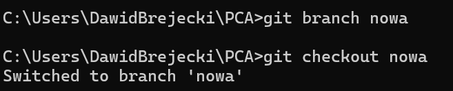 Tworzymy nową gałąź poleceniem branch, a przenosimy się na nią poleceniem checkout: