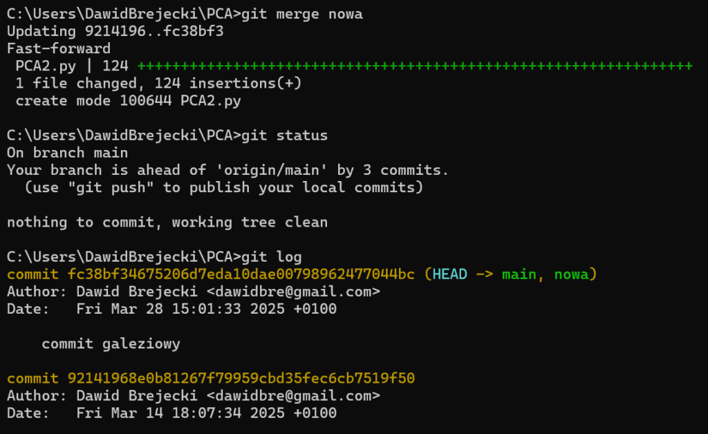 Oczywiście końcowym etapem naszej pracy jest wdrożenie zmian z naszej gałęzi do głównej. Scalamy gałęzie poleceniem merge:
