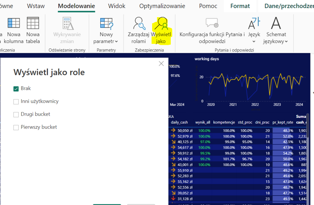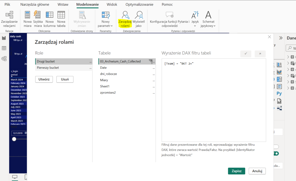 Każdy agent jest przypisany do jednego koszyka – BKT 1 lub BKT 2+, co wskazuje kolumna BKT. W związku z tym, że różne osoby odpowiadają albo za agentów z BKT 1, albo z BKT 2+, chcemy ograniczyć widoczność danych o agentach z innego koszyka. W tym celu uruchamiamy Power BI Desktop i na karcie „Modelowanie: wybieramy „Zarządzaj rolami”: