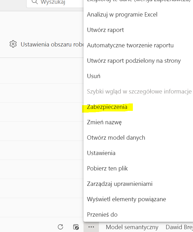 W obszarze roboczym przy zestawie danych do naszego raportu klikamy opcję „Zabezpieczenia”: