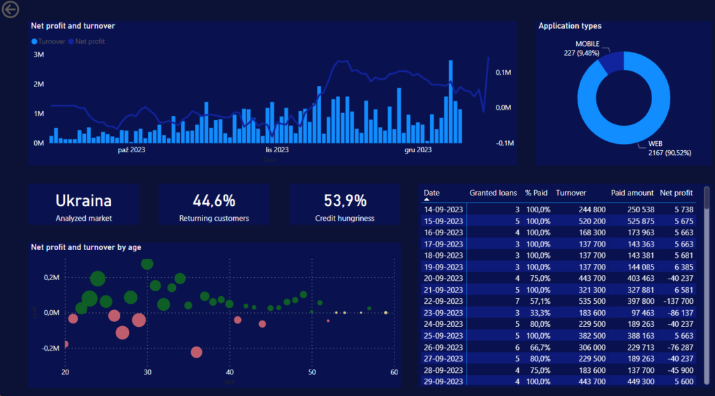 Te szczegółowe informacje, które nie zmieściły się na pierwszej stronie, umieszczamy na kolejnych stronach. Często umieszczamy tam pełne tabele – tak jak w naszym dashboardzie gdzie mamy umieszczone szczegółowe informacje dzień po dniu. Ponadto uzyskujemy szczegółowe informacje o klientach – ich wieku względem kluczowej KPI – net profit, turnover oraz o sposobach ich aplikacji. Dalszy etap uszczegółowienia względem pierwszej strony prezentuje wykres dzień po dniu net profit oraz turnover.