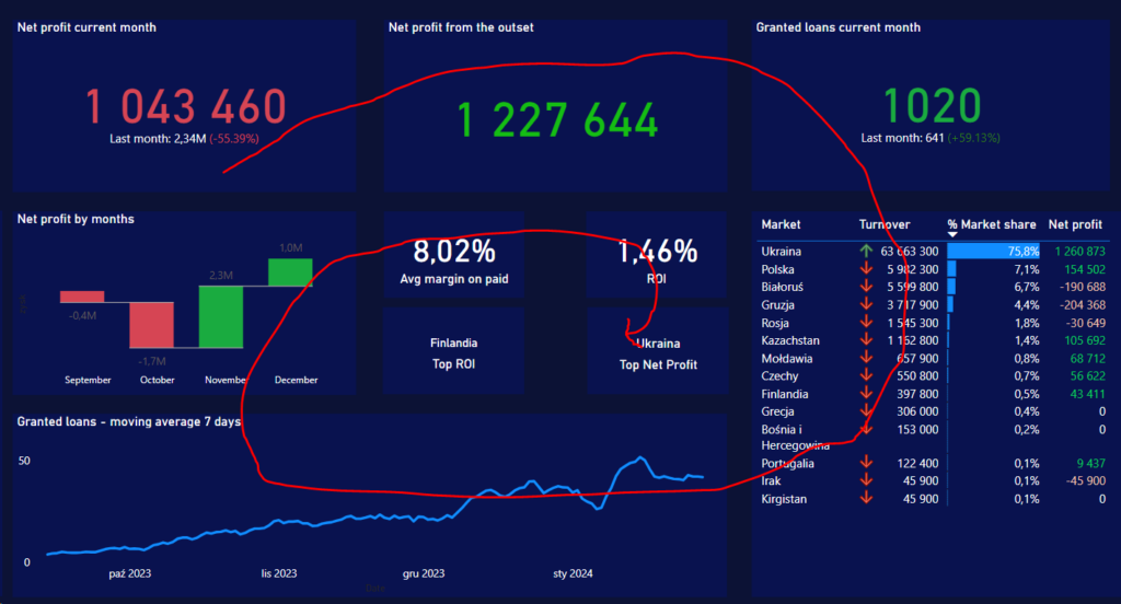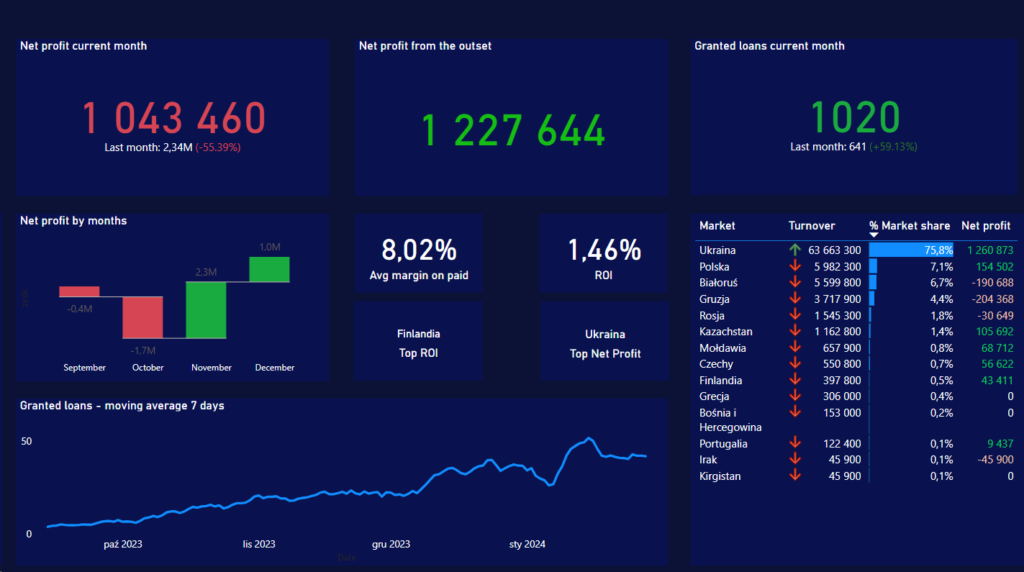 Najważniejsze KPIs – net profit oraz granted loans są umieszczone na górze w postaci dużych, czytelnych kart. Prezentują one klientowi ogólne dane o firmie ze wszystkich rynków – są to krytyczne informacje dla przedsiębiorstwa. Idąc wzrokiem dalej, klient poznaje informacje w podziale na państwa w jakich stacjonuje – rozwinięcie KPIs net profit oraz dodatkowe informacje. Idąc jeszcze dalej – otrzymuje szczegółowe informacje o granted loans na przestrzeni czasu – do którego najlepszym rozwiązaniem jest wykres liniowy. W środku strony znajdują się informacje o ogólnym stanie firmy – ale mniej istotne niż te wymienione powyżej, w związku z tym zajmują mniej miejsca w dashboardzie.