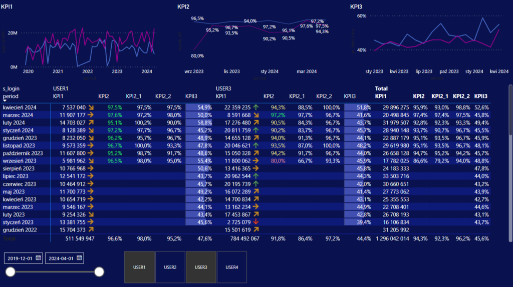 Na górze raportu, jako mniej istotne (i mniejsze) wykresy liczb przedstawionych w tabeli umożliwiają porównanie wizualne wybranych jednostek. Filtry po jednostkach umieszczone na dole – wielokrotne oraz filtry po czasie umożliwiają wyświetlenie tylko najważniejszych dla nas danych.