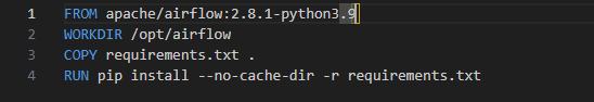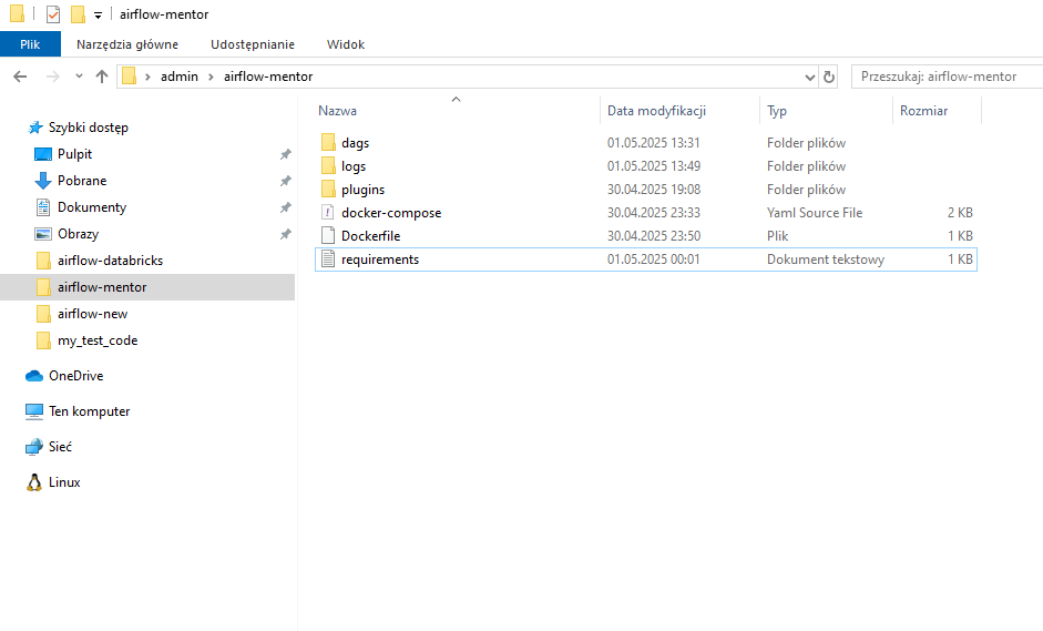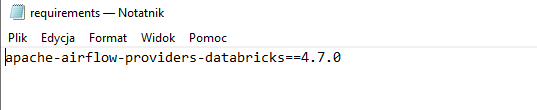 W pliku requirements umieściłem providera Databricks – ponieważ domyślnie nie ma go w obrazie Airflow. Pamiętajmy aby wskazywać odpowiednią wersję bibliotek – jeśli np. wskazałbym najnowszą, która nie jest kompatybilna z obrazem Airflow 2.8.1 kontenery zostałyby utworzone, ale aplikacja by nie zadziałała.