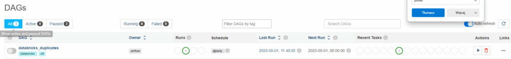 Po wklejeniu pliku python z naszym kodem DAG-owym w max kilka min DAG powinien pojawić się w GIU Airflow: