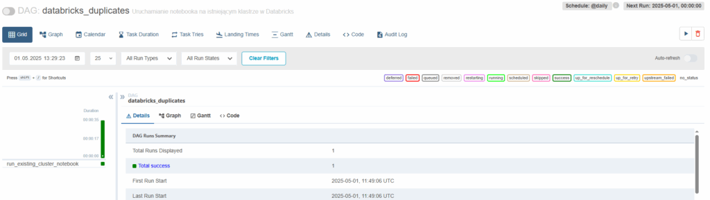 Oczywiście to był najprostszy DAG. W jednym DAG-u możemy uruchamiać wiele notebooków oraz łączyć się z wieloma usługami. Bardziej skomplikowane rzeczy będą zaprezentowane w następnych artykułach.