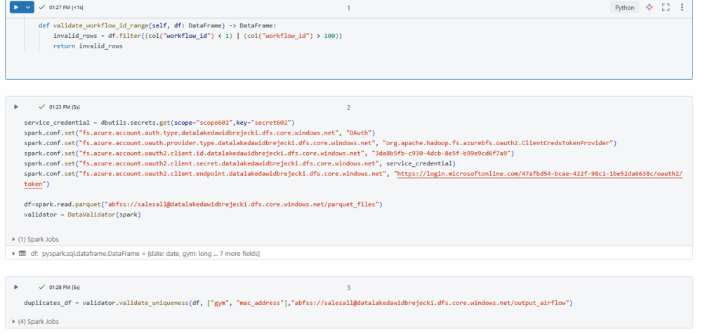 Jeszcze słowo o notebooku. Nasz notebook ma pobrać dane z Azure Data Lake Gen2, usunąć duble oraz zapisać do nowej lokalizacji w Data Lake: