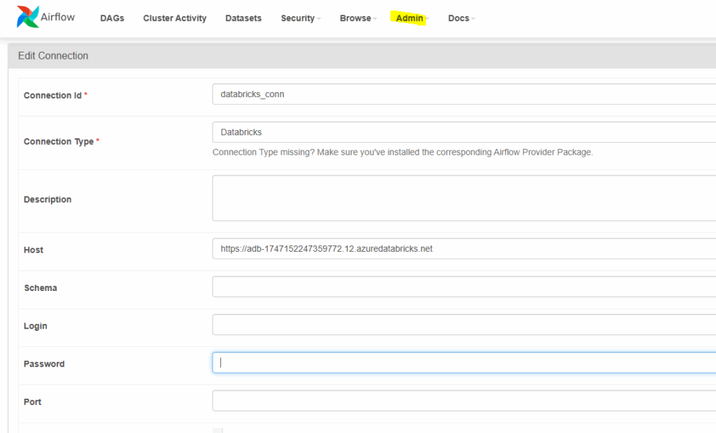 Po zalogowaniu do Airflow musimy utowrzyć connection do usług z jakich będziemy korzystać. W naszym przypadku chcemy tylko odpalić notebooka Databricks, więc takie connection tworzymy: