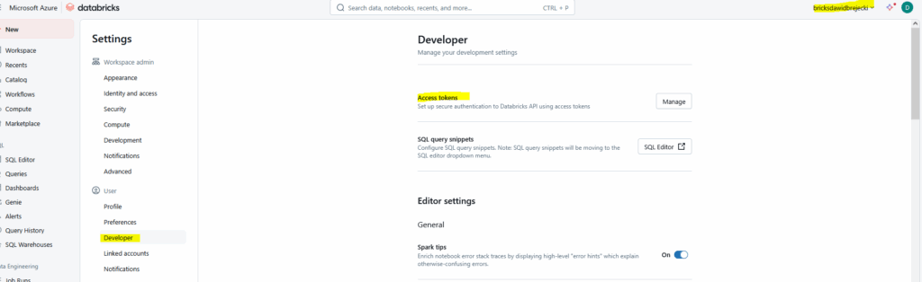 Wybieramy „Databricks” jako Connection Type oraz wpisujemy w pole Password access token do naszego workspace. Access token generujemy w Databricks – Settings – Developer – Access Tokens