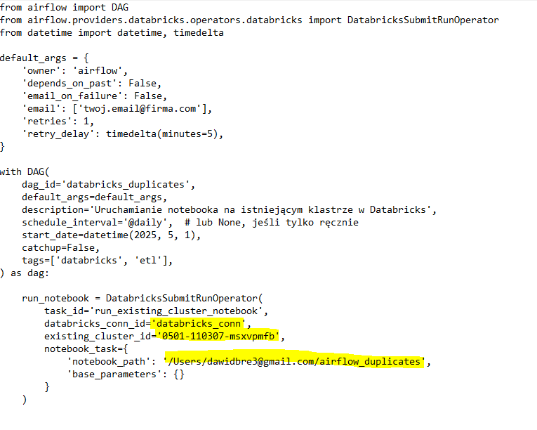 To co najważniejsze to wykorzystanie operatora DatabricksSubmitRunOperator , wpisanie poprawnej nazwy connection do Databricks, ID klastra który użyjemy oraz ścieżki do notebooka.