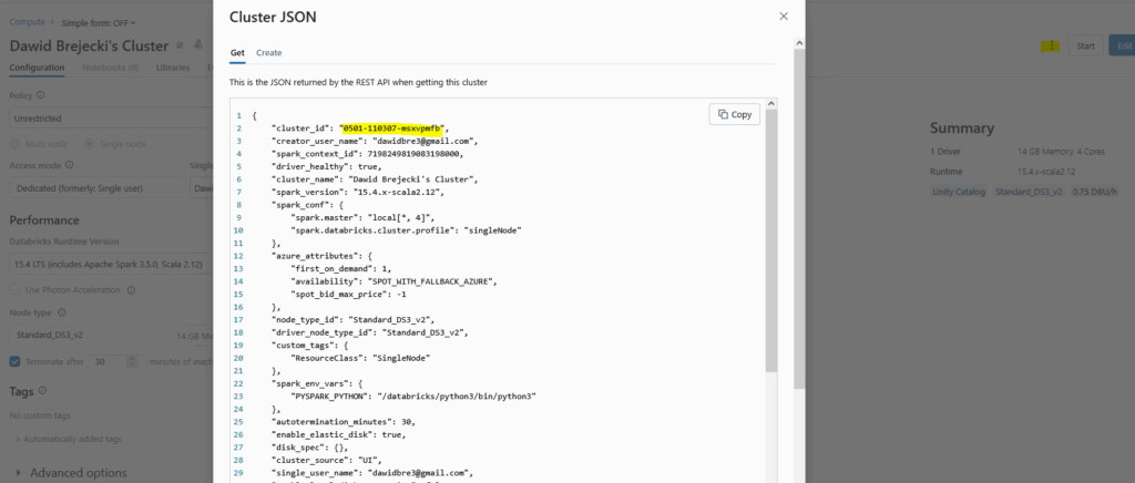 ID klastra znajdujemy klikając w Databricks nasz klaster – trzykropek – view JSON: