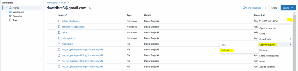 Sciezkę naszego notebooka pobieramy przechodząc do naszych notebooków – trzykropek-copy url/path – full path. Pomijamy pierwszy człon (Workspace/)