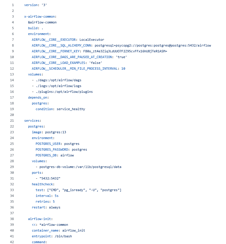 Aby postawić kontenery które utworzą nam apkę Airflow wykorzystujemy plik – docker – compose – wymagany generalnie do wszystkich aplikacji, które wymagają więcej niż jednego kontenera do pracy. Do tego wykorzystujemy plik Dockerfile, który opakowuje nam jednokonterową apkę lub współgra z docker-compose – polecenie build: . z docker-compose buduje obraz właśnie na podstawie pliku Dockerfile. Do tego dobrą praktyką jest dodanie pliku requirements.txt gdzie wypisujemy dodatkowe biblioteki (oraz ich wersje) wymagane do poprawnej pracy naszej aplikacji. Swoje pliki do Airflow umieściłem na repezytorium: https://github.com/dawid-brejecki/airflow-docker.