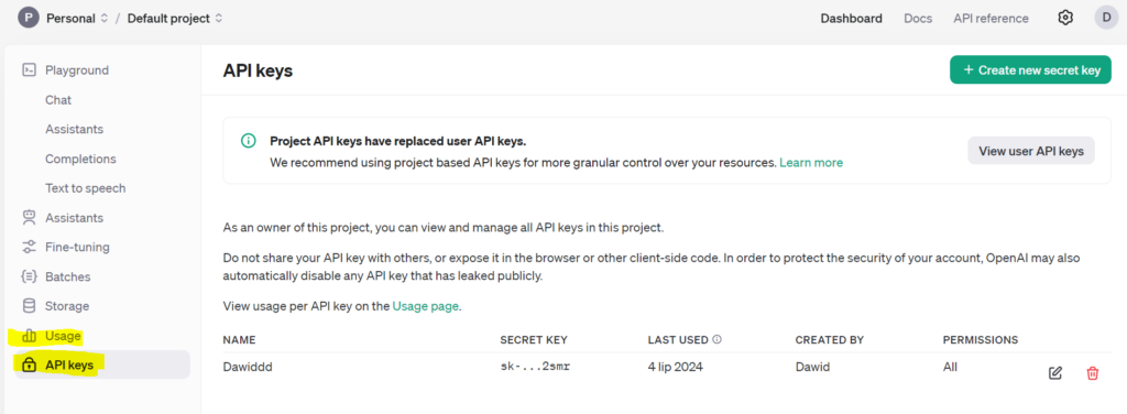 Najbardziej interesującą nas zakładką jest API Keys, gdzie widzimy wygenerowane przez nas klucze, za pomocą którego w kodach będziemy się łączyć z chatem. Możemy wygenerować także nowy klucz.
